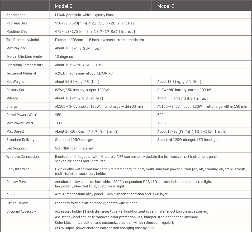 Ninebot-E Specifications Appearance Anodized silver + porcelain, white + sky blue; light grey Primary Materials Magnesium alloy+ aluminum alloy+ LEXAN resin Weight 52lbs (23.5Kg) Machine Size 15.4" x 23.2" x 43.3"~55.1" (390mm x 590mm x 1100~1400mm) Shipping Carton Sizes Mainframe: 24.4" x 17.3" x 18.5" approx 50 lbs, (620mm x 440mm x 470mm)